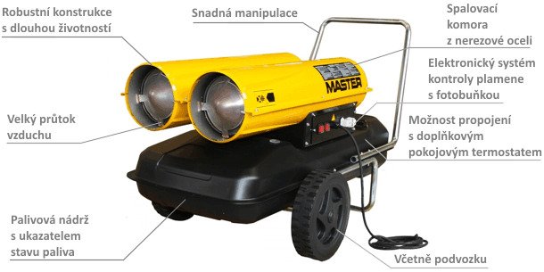 Naftová topidla Master s přímým spalováním jsou vysoce výkonným zařízením, které téměř okamžitě vytváří velké množství tepla tam, kde je zapotřebí. Tyto topidla vytváří zplodiny, proto se hodí spíše pro otevřené nebo dobře větrané prostory jako jsou: továrny, sklady, staveniště. Naftová topidla s přímým spalováním jsou známy svým vysokým výkonem, spolehlivostí a bezpečností.