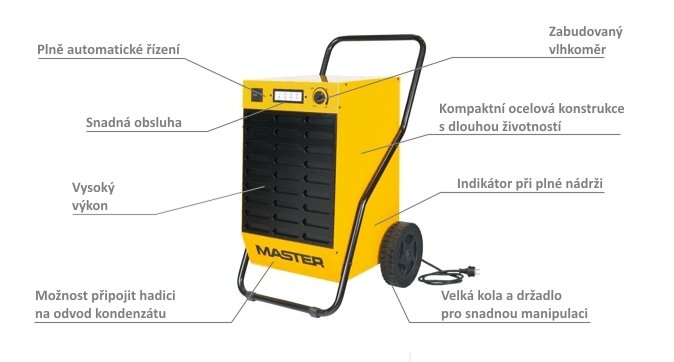 Profesionální odvlhčovač vzduchu MASTER DH 62 je vhodný pro vysoušení středně velkých prostorů.